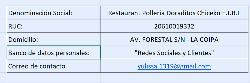 A través del presente documento, DORADITOS CHICKEN con RUC Nº 20610019332 con domicilio en AV. FORESTAL S/N - LA COIPA SAN IGNACIO - CAJAMARCA, en cumplimiento con lo estipulado en la Ley Nº 29733, Ley de Protección de Datos Personales y su Reglamento, aprobado mediante Decreto Supremo Nº 003-2013-JUS, les informa a los usuarios que DORADITOS CHIKEN E.I.R.L trata sus datos a través del presente sitio web.